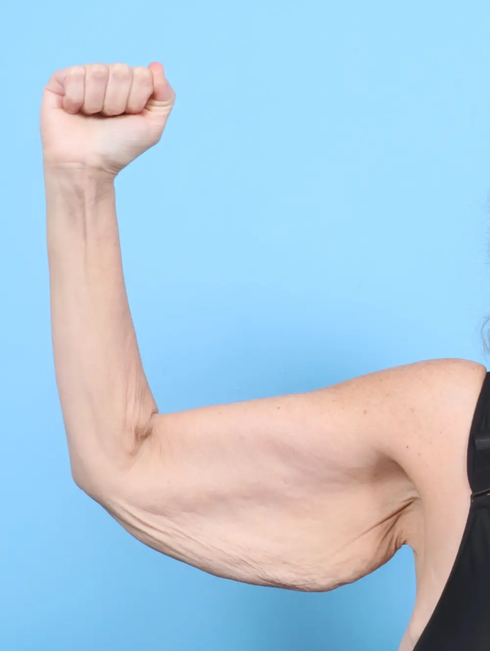 This 63 year old woman from Sacramento, CA is 5’5 and 132 pounds. She had an arm lift (brachioplasty) after losing 140 pounds. These results are shown six months after surgery.