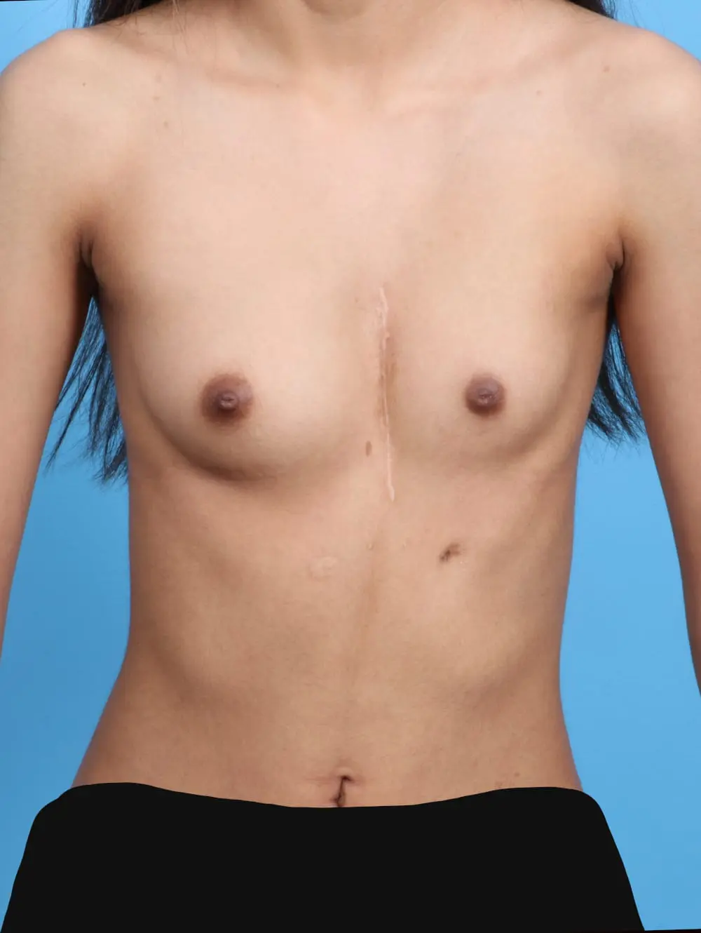 This 18 year old woman from Folsom, CA is 5’2 and 83 pounds. She had a Breast Augmentation using Sientra Silicone cohesive gel implants to balance out her breast asymmetry due to her concaved chest also known as pectus excavatum. The implants were placed them behind the muscle. An incision in the breast crease was used. These results are shown 6 months after surgery.